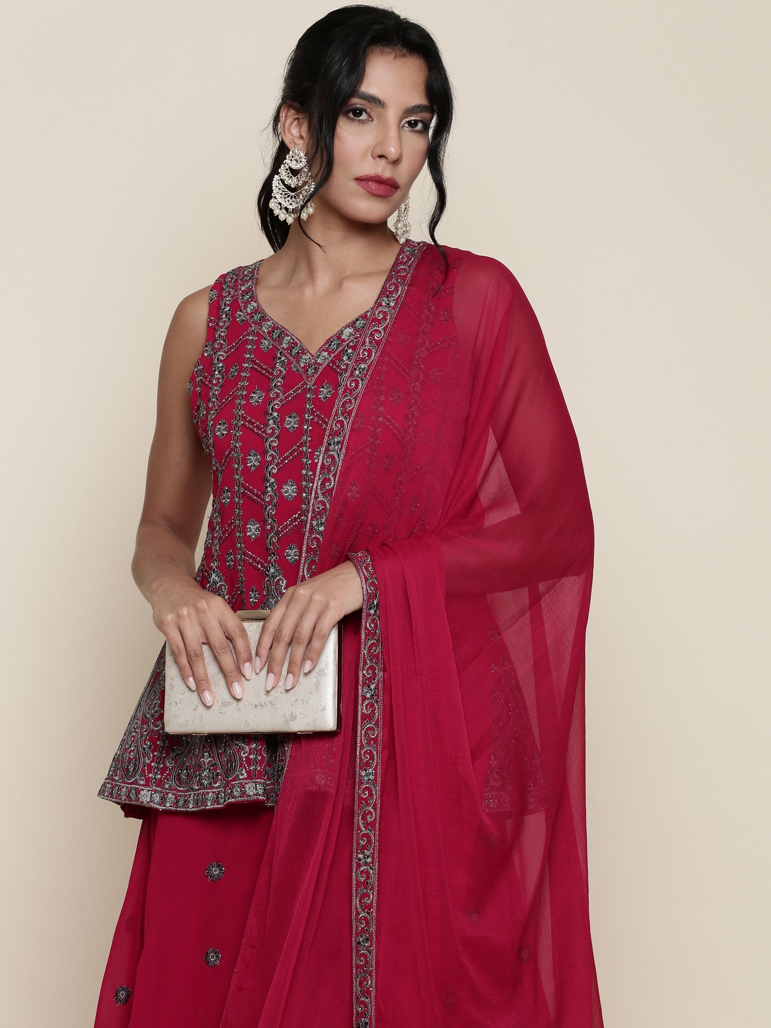 Magenta georgette embroidered peplum and palazoo Three piece set