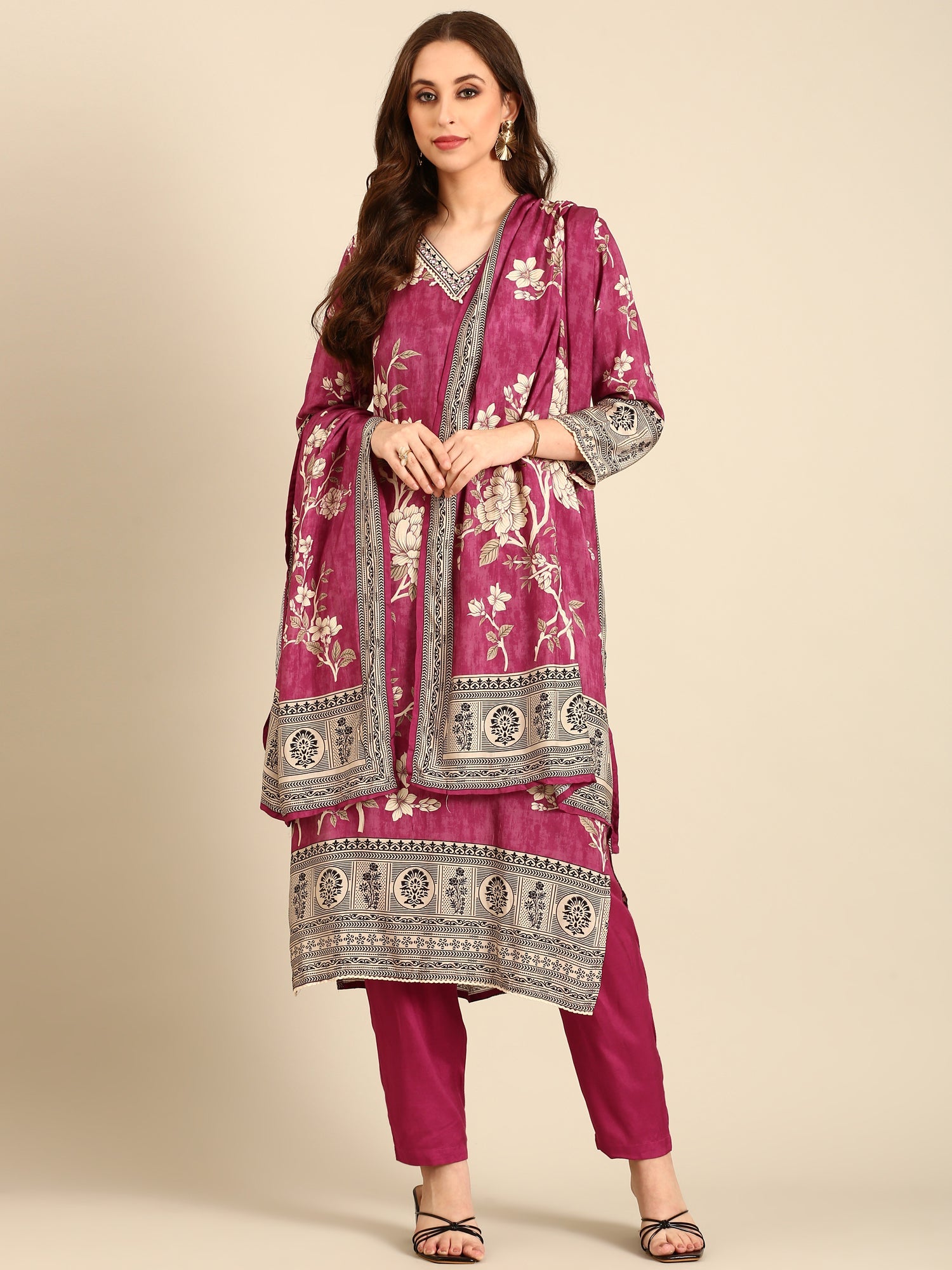 Elevate your style with this Magenta Muslin fabric three-piece suit set, featuring a stunning all-over print on both front and back. The V-neck design is beautifully embellished with mirror work, adding a touch of sparkle and sophistication. Perfectly combining comfort and elegance, this suit set is ideal for making a memorable impression at any event.