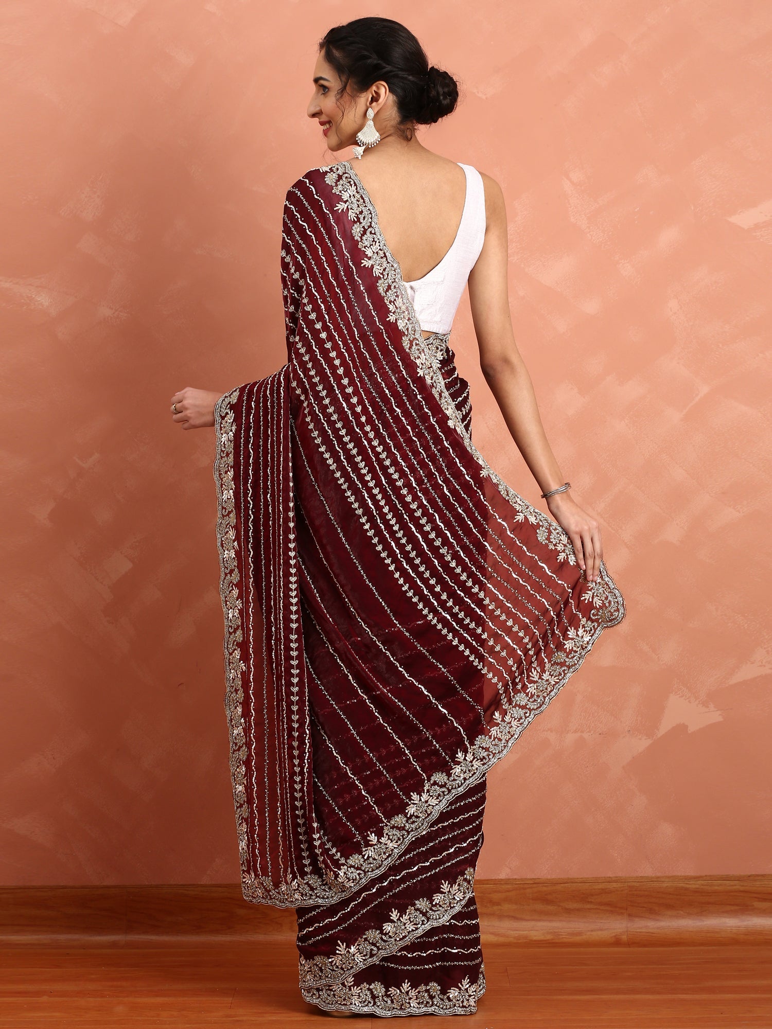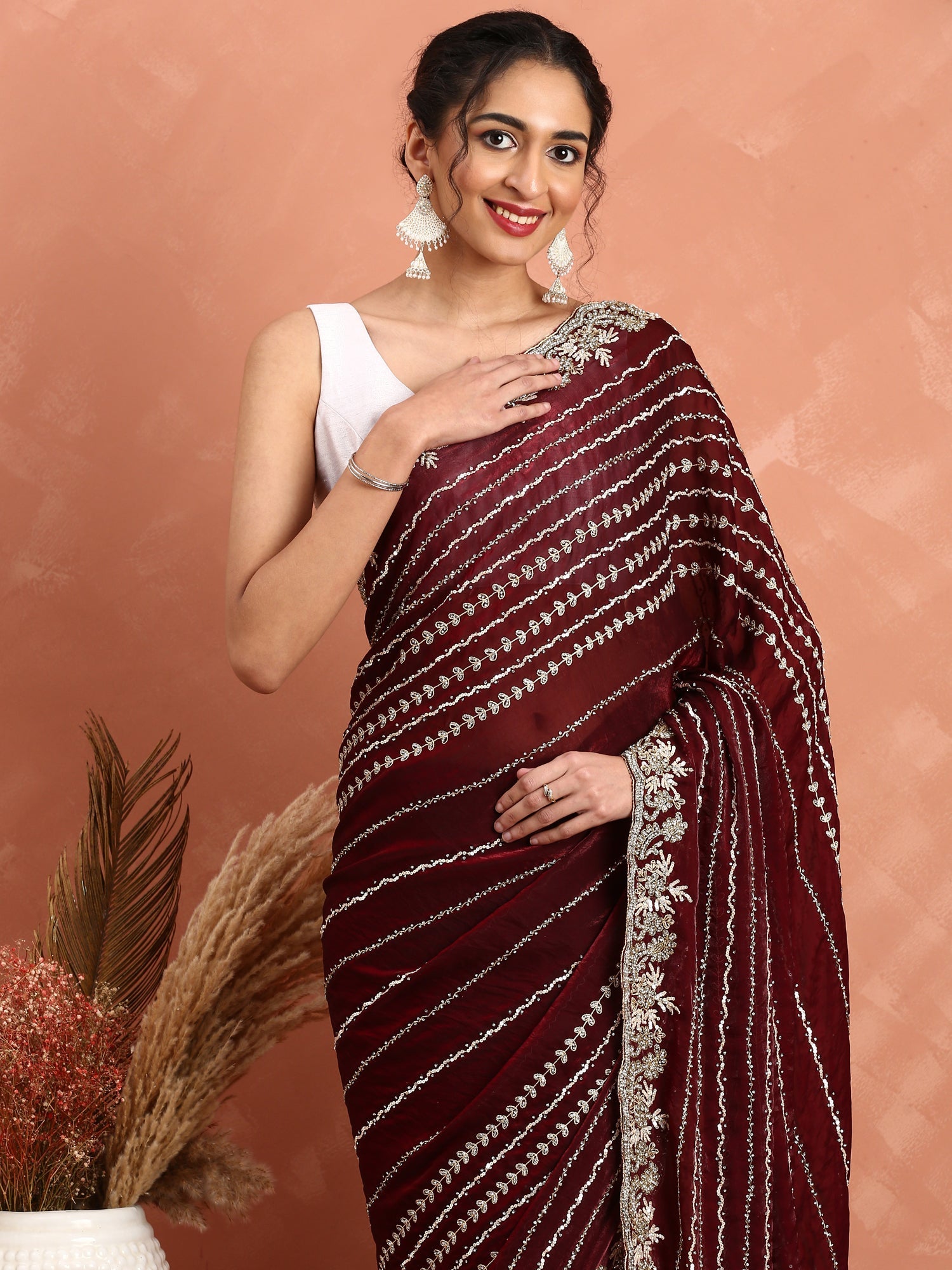 Elevate your elegance with this Maroon Saree, exquisitely hand-embroidered using fine Swarovski crystals and cut dana. The intricate detailing adds a refined shimmer, perfect for special occasions and formal events. Its rich maroon hue complements the artistry, ensuring you stand out with understated sophistication and timeless style.