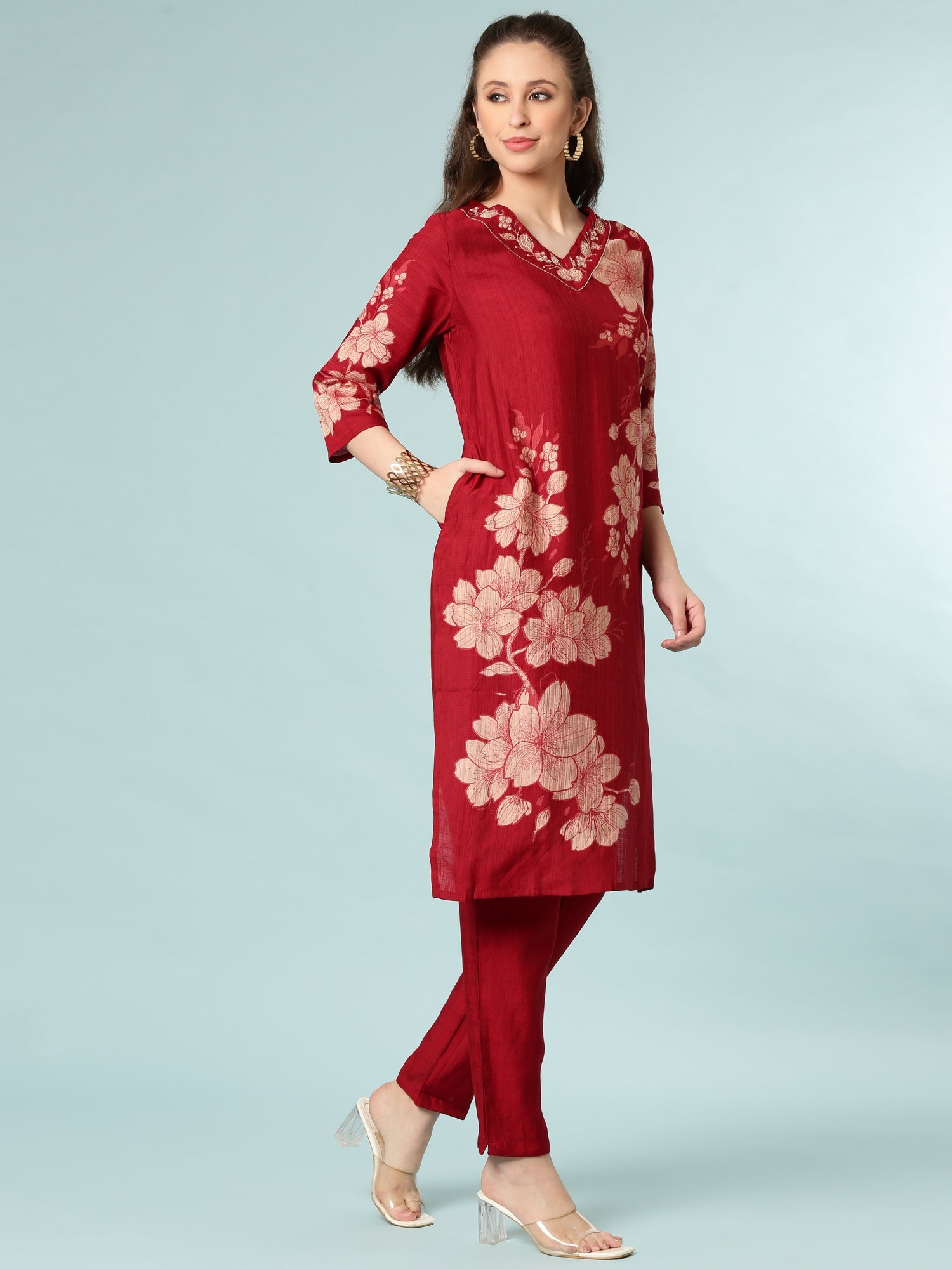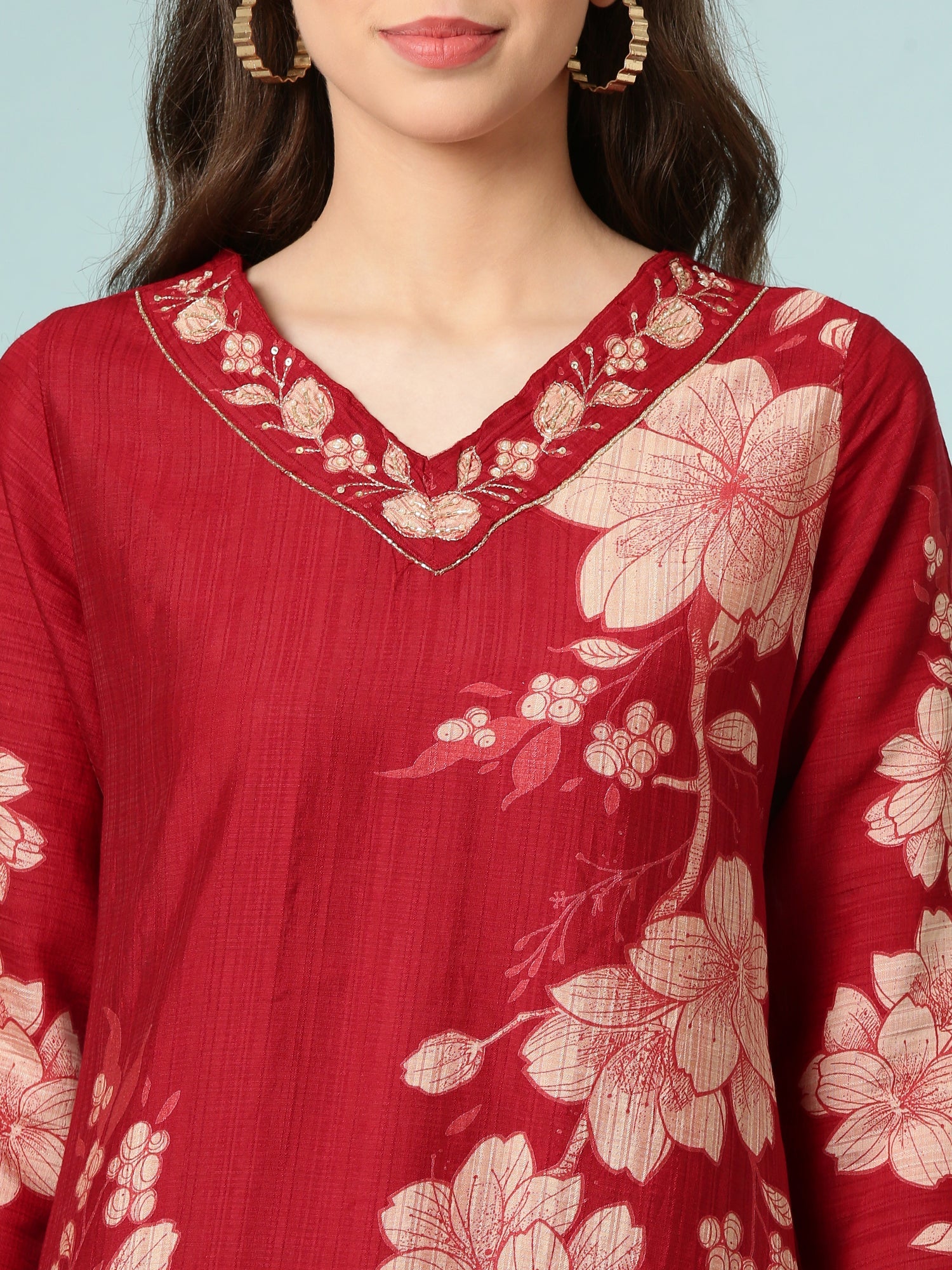 Maroon Viscose Rayon Floral Printed Two Piece Set