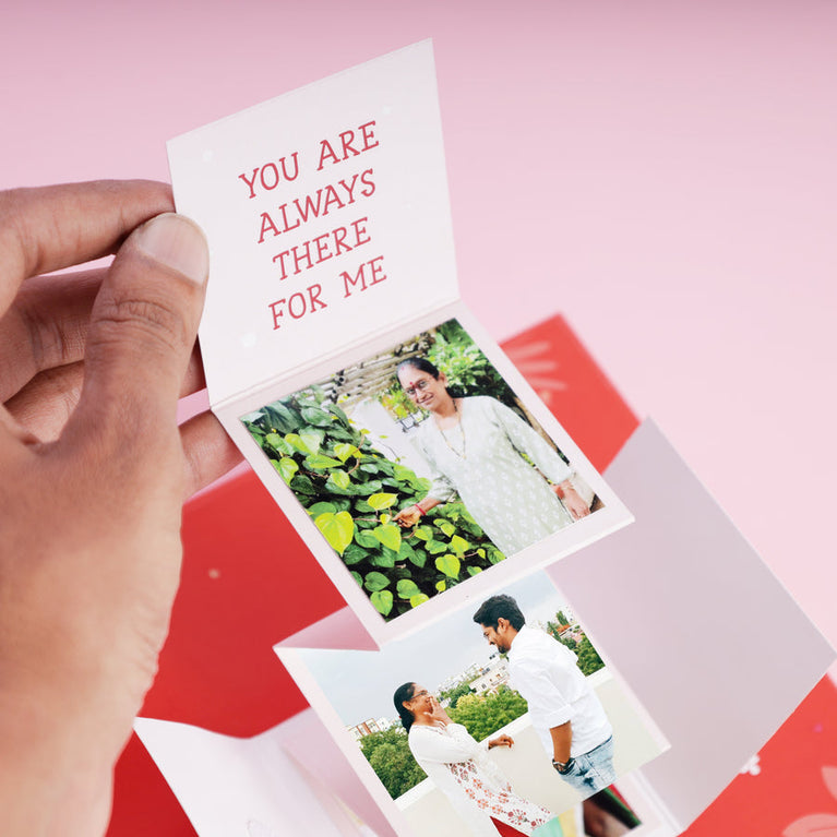 Here’s a gift for Mother that begins with your mom's favorite memories. This hamper starts with a surprise on top: a dialogue box that opens up to 3 heartfelt messages and 3 favourite memories captured in photos. It's the kind of surprise that starts the celebrations before she even reaches the gifts.Further, the hamper includes the following gifts: Pocket Hug Card - Give your mom a hug that fits in her pocket (and her heart). When you can’t be there to hug her, this heart-shaped hug will do the trick. It’s tiny, adorable, and full of cuteness. And, it also comes with a card that has a sweet message for your mom.Rose Green Tea - A pouch of rose-kissed green tea to give your mom her much-needed tea-time therapy.Medal with Certificate - Moms deserve all the appreciation in the world for everything they do. Give her the ultimate compliment with a certificate and a medal (yes, a real medal) that certifies your mom as the Best Mom Ever.A Sash - Mothers are the real stars! Make her feel like one with this adorable world's best mom sash.Best Mom Magnet - Surprise your mom with a special magnet designed to always remind her that she's the best mom in the world. The magnet is customised with her favourite pictures so that you can easily change the photos whenever you like. Candle - She lights up everyone’s life. This time, let a candle light up hers. A calming best mom candle in a jar to help her unwind in the coziest way.Specifications:Hamper Box size - 18.2 x 18.2 cmsBest Mom Medal card - 12.3 x 17.5 cms.Heart of the Family card - 15 x 11 cms