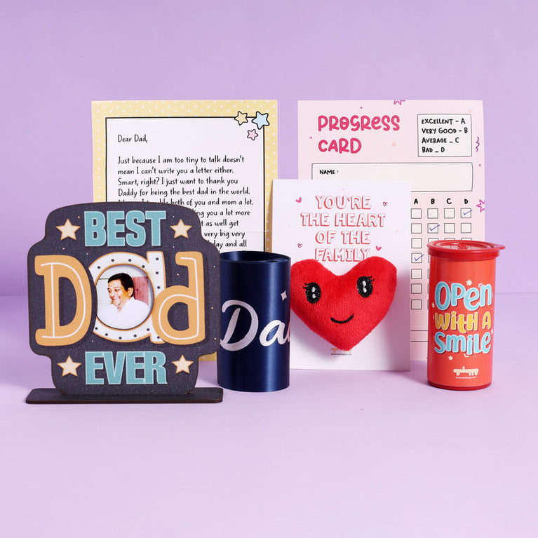 Know someone who just got promoted to 'Dad', and he’s already the best at it? This First Father’s Day Hamper is a warm little hug for the new superhero.The hamper includes:Letter for New Dad - Want to surprise a new dad who can’t stop being excited about the baby? Gift him an outrageously cute letter written by his little baby! This gift is adorable enough to make him melt like a slab of butter.Report Card for New Dad - For the father who's giving his all, here’s a hilariously cute New Dad Report Card to evaluate his baby-handling skills. Whether he's acing the diaper duty or needs a little improvement in learning burping techniques, this report card is a sweet and funny way to tell him that he is doing great!A Sash - Fathers are the real superheroes! Make a new dad feel like one with this adorable world's best dad sash.Best Dad Ever Table Top - An intricate work of art to adorn the new dad's bedroom/living room with. Made with lots of love and creativity, this gift tells the new dad everyday that he is the best dad ever! And, you know the best part? You can customise the table top with their favorite picture. Go ahead, and make their day. First Father's Day Card - Some moments deserve to be remembered forever. Celebrate a new dad’s first Father’s Day with a card that makes the moment even more special. Specifications -Size of the Hamper Box : 14 x 17.8 x 7 cmsSize of the Letter for New Dads : 14.8 x 21 cmsBest Dad Sash : RegularSize of the Report Card for New Dads : 14.8 x 21 cmsSize of the First Father's Day Card : 12.5 x 15 cmsSize of the Table Top : 12.7 x 13.7 cms
