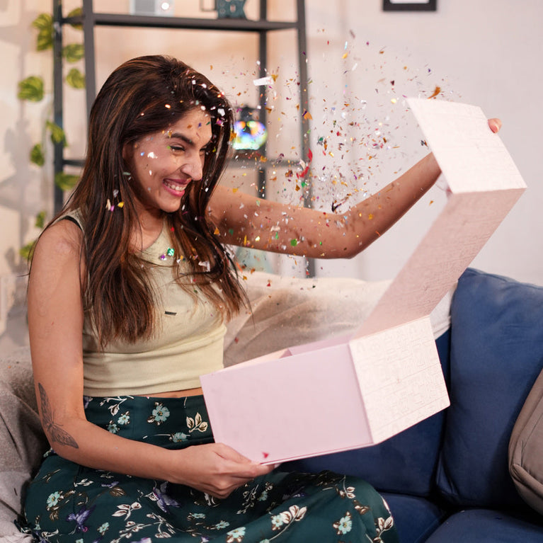 Valentine’s Week just got special: 8 surprises, glitter shower, and a special message in your own voice - all in one hamper. Celebrate the 8 days of Valentine’s with an adorable valentine gift hamper that showers your valentine with glitter and plays a loving message as soon as they open the hamper.All you have to do is send us an audio message and we will record it for you. And in case, you can't, we will add the sweetest song/message for your valentine on our own.