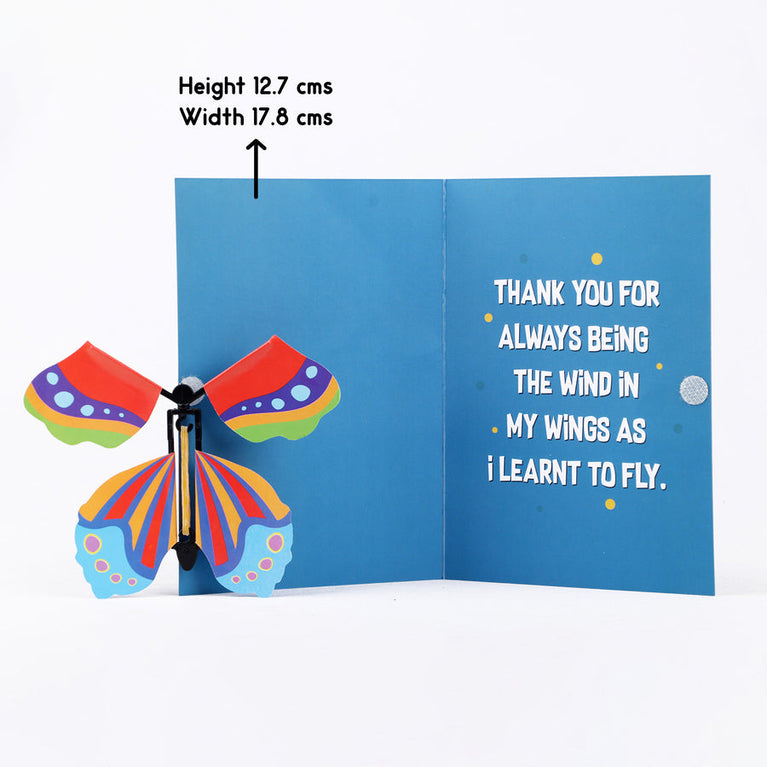 🦋 Butterfly Note:The card has to be opened with a mild jerk for best results. Sometimes, the butterfly tends to get tired during the shipment journey. If possible, we request you to open the card when you receive it and twist the butterfly’s tail the same way you rotate a key to recharge it. Once you’ve completed the motion 40-50 times, place it inside the card and close it.