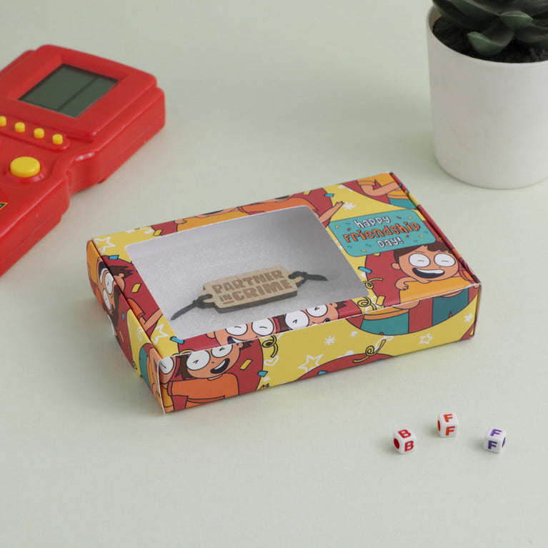 Ever wondered how to show your partner in crime just how much they mean to you? This Friendship Day, give them a gift that'll make them chuckle. Surprise your true partner-in-crime with a friendship day band designed especially for them. The band comes with a wooden centerpiece engraved with 'partner in crime'—perfect for your forever-there-for-you friend!Specifications:Size of the Wooden Centerpiece - 3.7 x 1.6 cmsContent on the Band - Partner in Crime