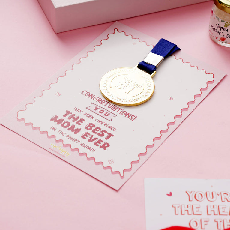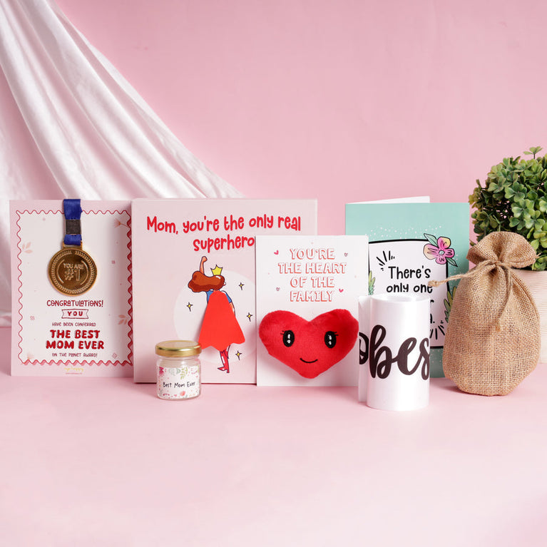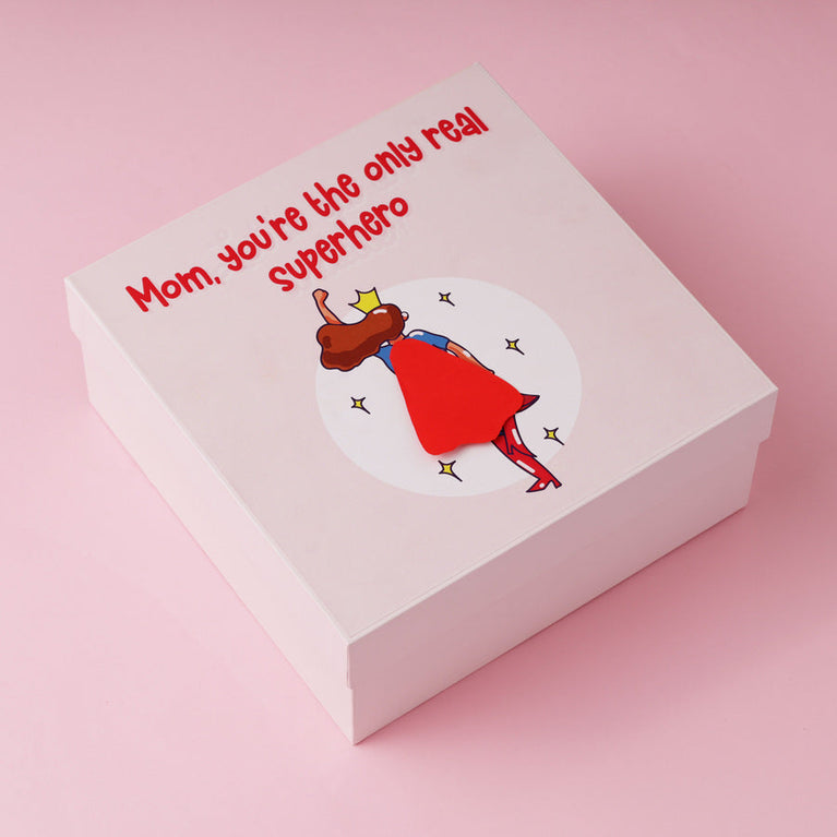 Mothers are the real superheroes of our lives! She might not fly or shoot lasers from her eyes, but she’s got the power to do everything - often all at once. We know that. Therefore, we decided to come up with a gift that has a cape(yes, a real cape!), just to make it official. This Mother’s Day shower your mom with love and happiness through this adorable Supermom Hamper – a perfect gift for Mother! The hamper is designed with 6 gifts: Pocket Hug Card - Give your mom a hug that fits in her pocket (and her heart). When you can’t be there to hug her, this heart-shaped hug will do the trick. It’s tiny, adorable, and full of cuteness. And, it also comes with a card that has a sweet message for your mom.Rose Green Tea - A pouch of rose-kissed green tea to give your mom her much-needed tea-time therapy.Medal with Certificate - Moms deserve all the appreciation in the world for everything they do. Give her the ultimate compliment with a certificate and a medal (yes, a real medal) that certifies your mom as the Best Mom Ever.A Sash - Mothers are the real stars! Make her feel like one with this adorable world's best mom sash.Candle - She lights up everyone’s life. This time, let a candle light up hers. A calming best mom candle in a jar to help her unwind in the coziest way.Mirror Card for Mom - Add a touch of magic to your greeting card and express how much your mom means to you. This special greeting card is designed with a mirror attached to it so that when your mom opens the card, she will see her own face reflecting on it.Specifications -Hamper Box size: 18.2 x 18.2 cmsBest Mom Medal Card: 12.3 x 17.5 cms.Mirror card: 25.4 x 17.7 cmsHeart of the family Card: 15 x 11 cms