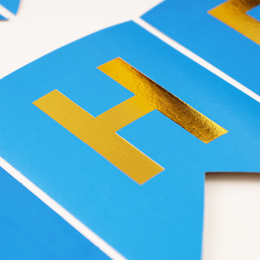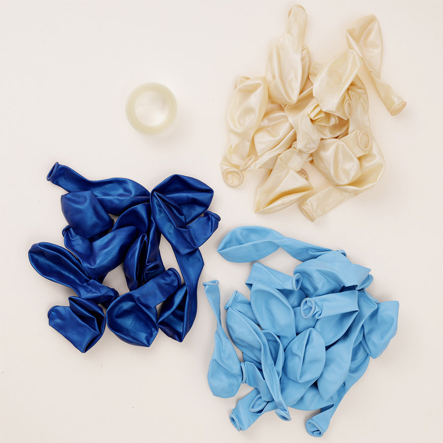 Includes: Blue foil curtains, “Happy Birthday” banner, Metallic balloons, Blue balloons, White balloons