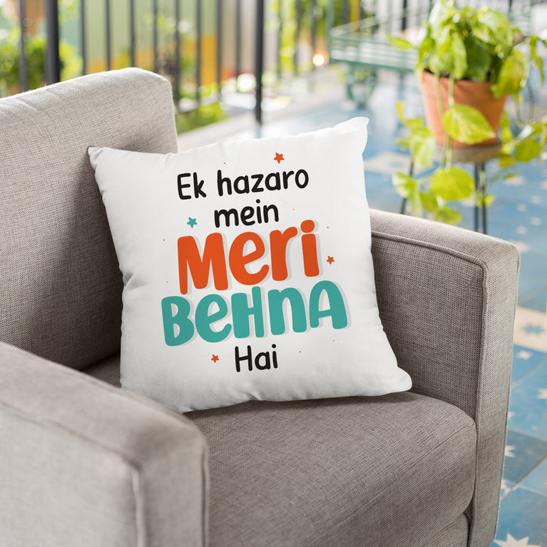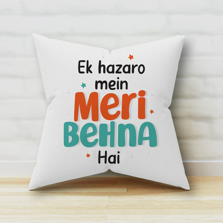Give your best sister a special reminder of how truly amazing she is with this cushion cover. Designed for the Best Sister: With the message “Ek hazaro mein meri behna hai,” this cushion is a sweet token that says it all. Heartfelt & Unique: A perfect way to show her that she's one of a kind, just like this cushion. Size of the cushion cover: 25 x 25 cm