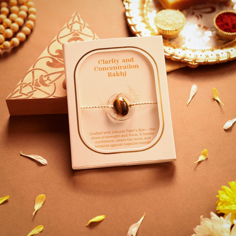 This Clarity and Concentration Rakhi is crafted with natural Tiger’s Eye, the stone of strength and focus. Known for boosting confidence, clearing the mind, and protecting against negative energy, this rakhi helps sharpen your brother's clarity and concentration.The Tiger’s Eye stone is authentic and certified by the Gemological Institute (certificate not included with the Rakhi).Tie this rakhi to your brother and empower him with focus, strength, and positive energy this Raksha Bandhan.Size: 3 x 3 cm