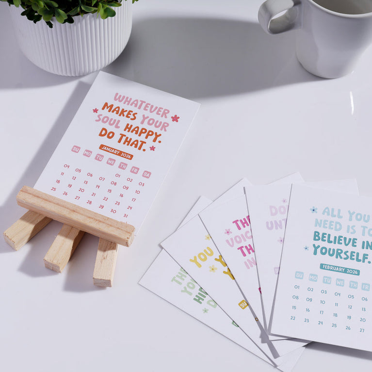 A happy little calendar that keeps your mood in the right place, no matter how the day goes. Every month it gives you a reminder to choose yourself, choose joy, and choose better days.Perfect for anyone who wants their desk to feel lighter and more positive. And a lovely new-year gift for someone who could use a bit more balance.Specifications-Size of the Easel : 4.5 x 3.5 inchesSize of Cards : Size : 3.4 x 5 inches
