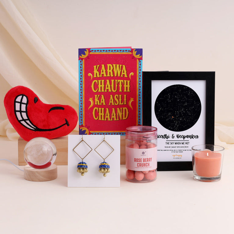 The first Karwa Chauth is always special. It’s the beginning of a lifetime of traditions, love, and promises. Therefore, her first Karwa Chauth deserves to be celebrated not just with rituals, but with 24 hours of love. Here's a hamper to make sure that your wife feels cherished, adored, and truly special from the moment she wakes up till midnight. This surprise comes with 7 of our romantic gifts neatly gift-wrapped into one hamper box. Each gift has instructions on when to open the box. Open this right after you wake up -Ted Talks - Start her very first Karwa Chauth morning with your voice wrapped in a cuddle. A soft, heartwarming surprise to remind her she’s never alone in this journey of love. The sweetest way to say “Good morning, my love” on her very first fast for you. It is the cutest way to tell your wife how much you love her. This insanely fluffy heart comes with an audio device hidden inside. All you have to do is share a voice message with us and we’ll upload it on the device so that every time it is pressed, your voice will play from the stuffed toy. And you know what’s cooler? This device is re-recordable. That means you can choose to record a new message every morning for your partner to make them smile with. Open this at night - Moon Lamp - A little moon for her before the real one rises - just for her first Karwa Chauth night. To light up the moment when she waits for the moon with love in her eyes.Open at noon - Peach Scented Candle - A fresh peachy fragrance to keep her relaxed and glowing through the day. Perfect for her first Karwa Chauth afternoon.Open this after lunch - Rose Almond Chocolate - A sweet little surprise waiting for her after the fast. Rosy, nutty, and filled with loveOpen this in the evening - Jhumka - A pair of pretty jhumkas to complete her Karwa Chauth look.Open this right before bed - Mirror Card - Greetings Cards never go out of fashion in matters of love. Here’s a surprise mirror card for your wife which is guaranteed to make her blush. This card tells them that they are your forever chaand.Open at midnight -The Star Above Us - A piece of the sky, capturing the moment your forever began. The perfect ending to her first Karwa Chauth - a star that marks your love story. If there’s a special moment that you’d like to frame, like the moment of your wedding or the time you first met your wife - this is best way to make it special.
