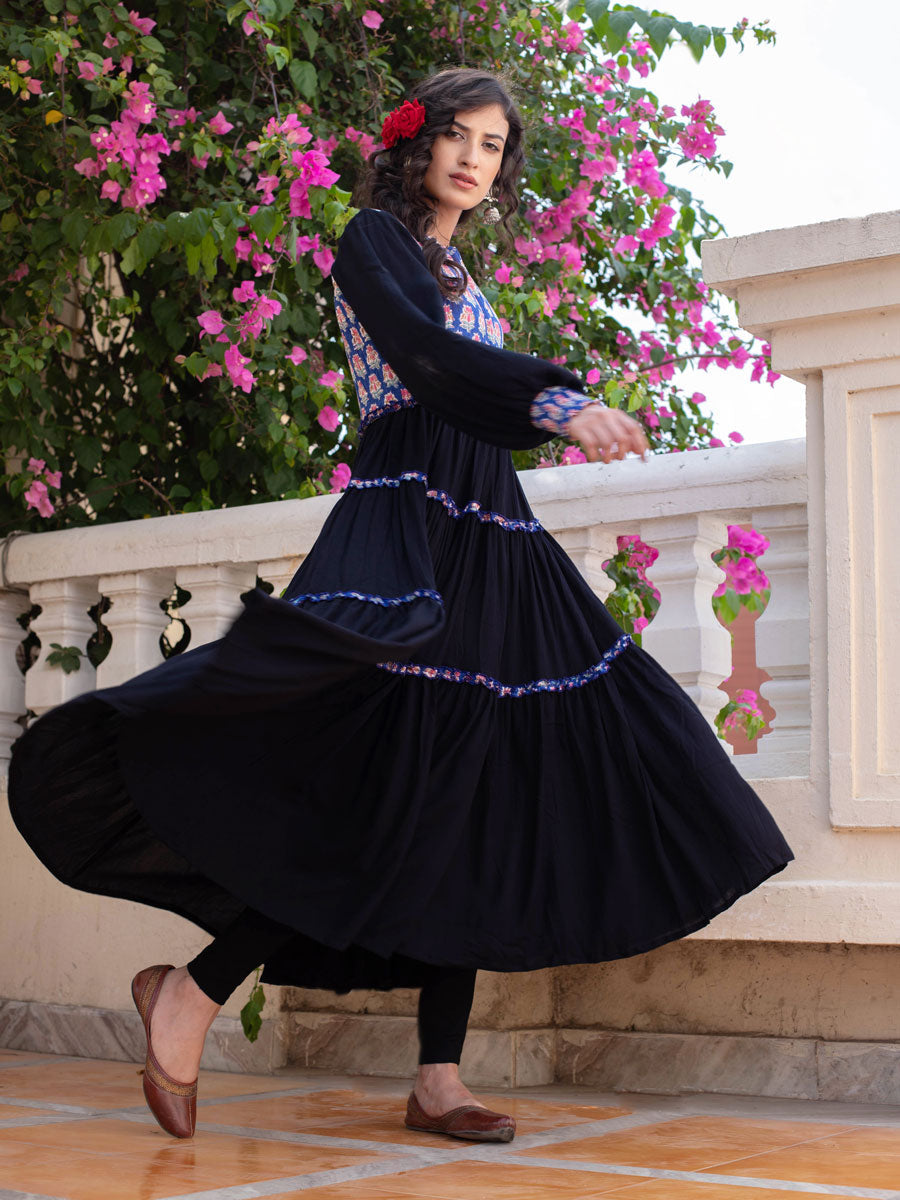 A gorgeous centre slit anarkali dress featuring quilted bodice, dramatic tiered bottom and wide fall bishop sleeves. Goes best with palazzos, cigarette pants, denims or a skirt.