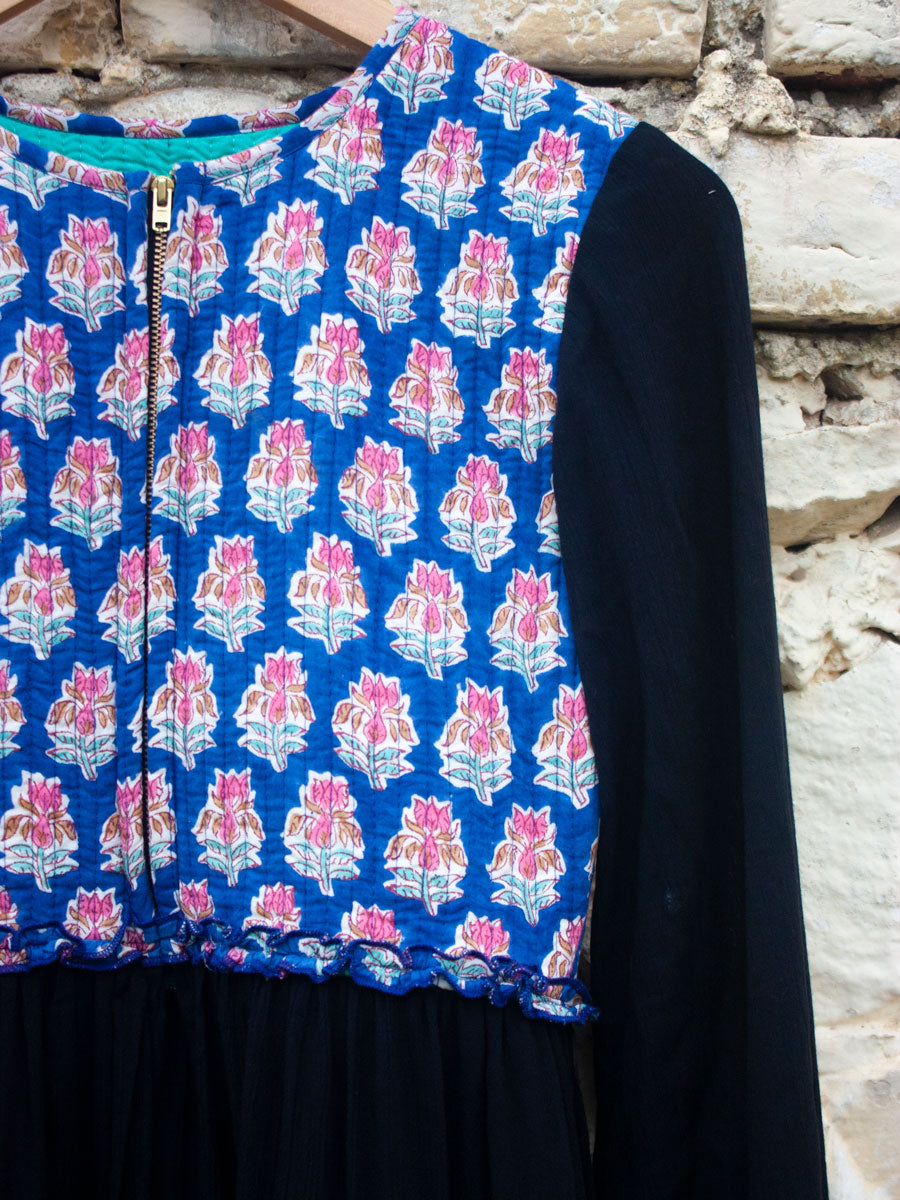 The bodice of this garment is hand block printed and quilted on finest cotton, tiered bottom and sleeves are crafted in viscose with detailing. The sizes mentioned are garment sizes. Our model is 5'6" and wearing XS size.