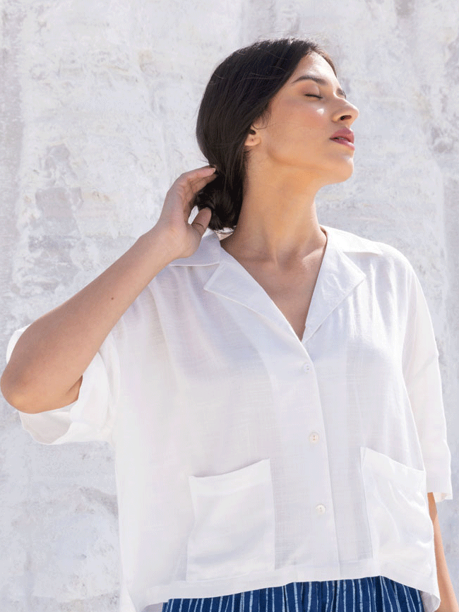 - A versatile white crop top paired with indigo wrap-around palazzo