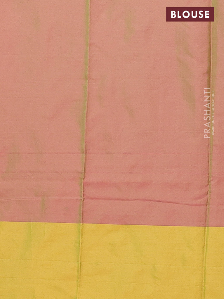 Arani semi silk saree dual shade of magenta pink and mustard green with allover copper zari weaves and zari checked border
