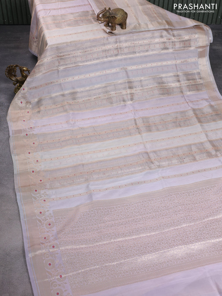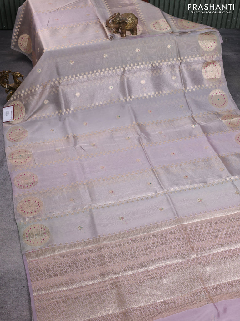 Banarasi tissue semi silk saree pastel grey and mild lavnder with allover zari weaves and zari woven floral border