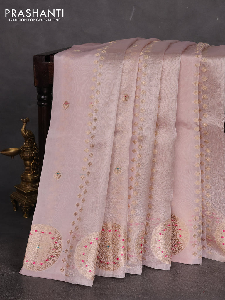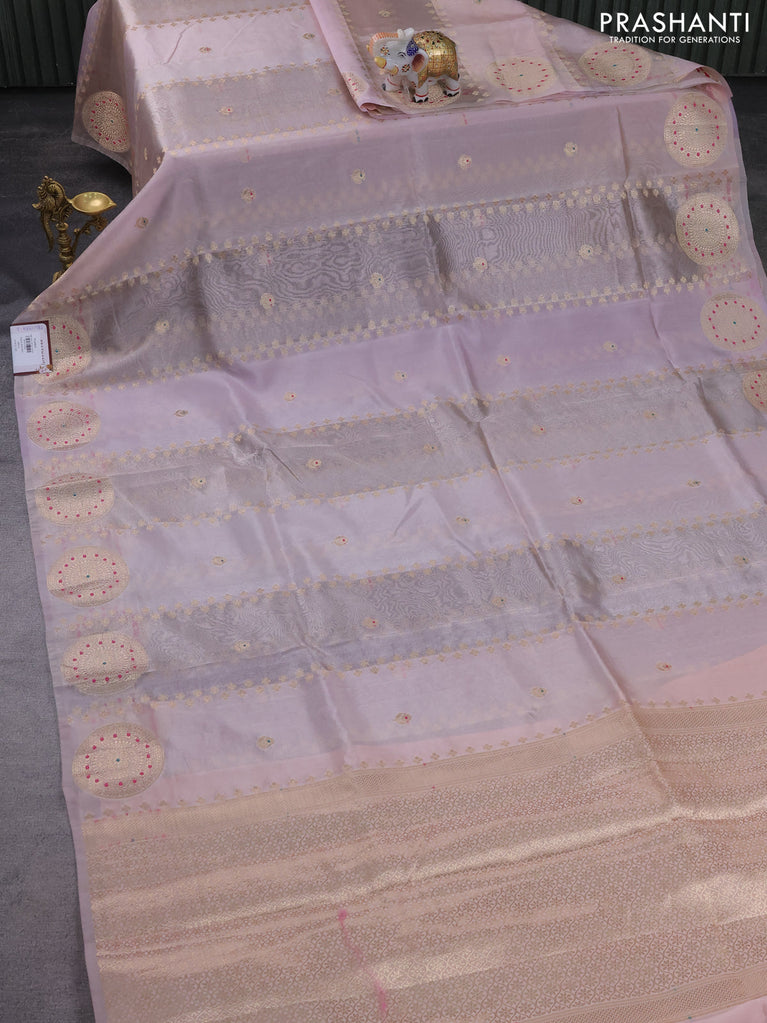 Banarasi tissue semi silk saree pastel pink with zari weaves & buttas and floral zari woven butta border