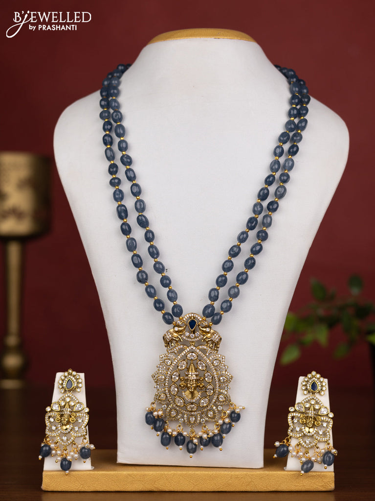 Beaded double layer blue necklace tiruapti balaji pendant with sapphire & cz stones and pearl & beads hanging in victorian finish