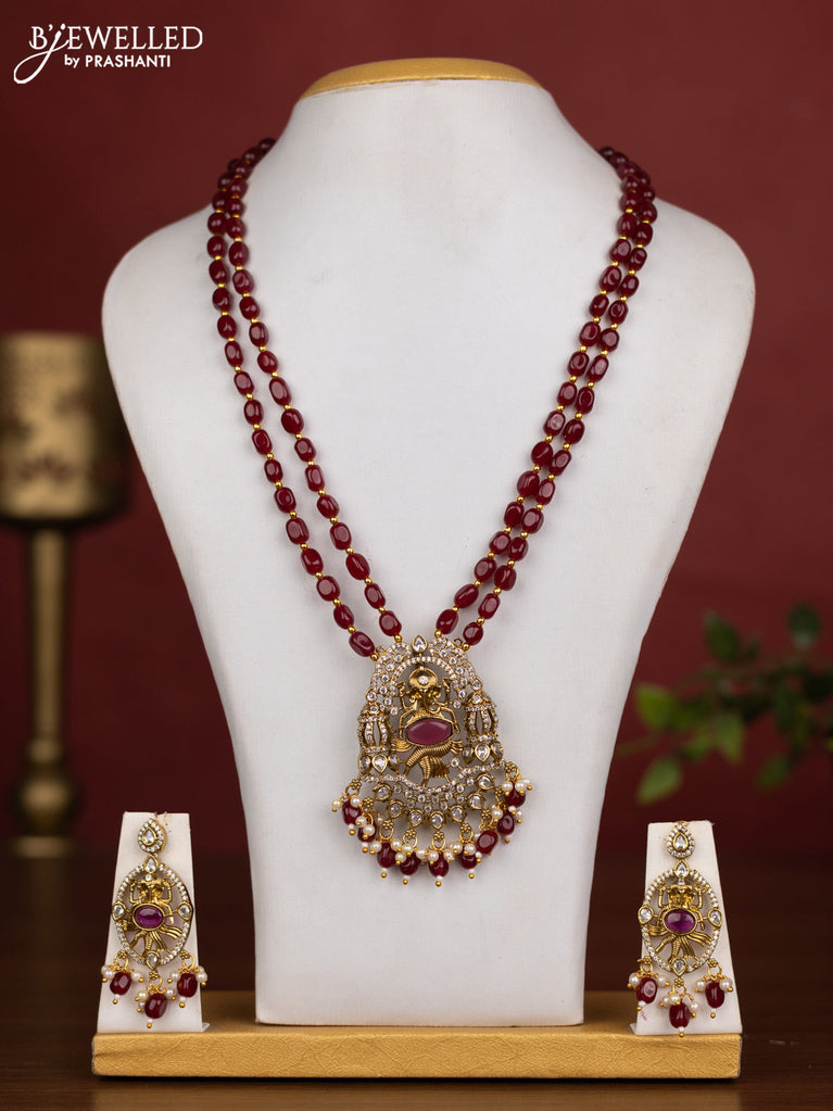 Beaded double layer maroon necklace ganesha pendant with ruby & cz stones and pearl & beads hanging in victorian finish