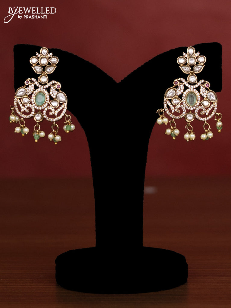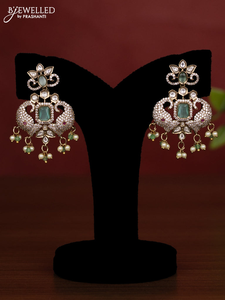 Beaded triple layer mint green necklace peacock design with kundan & cz stones and pearl & beads hanging