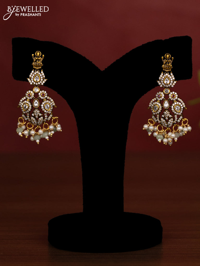 Beaded triple layer mint green necklace lakshmi pendant with kundan & cz stones and pearl & beads hanging in victorian finish