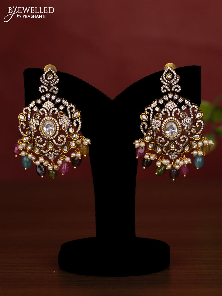Beaded triple layer multicolour necklace parrot design with kundan & cz stones and pearl & beads hanging in victorian finish