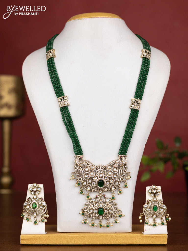 Beaded triple layer green necklace peacock design with emerald kundan & cz stones and pearl & beads hanging