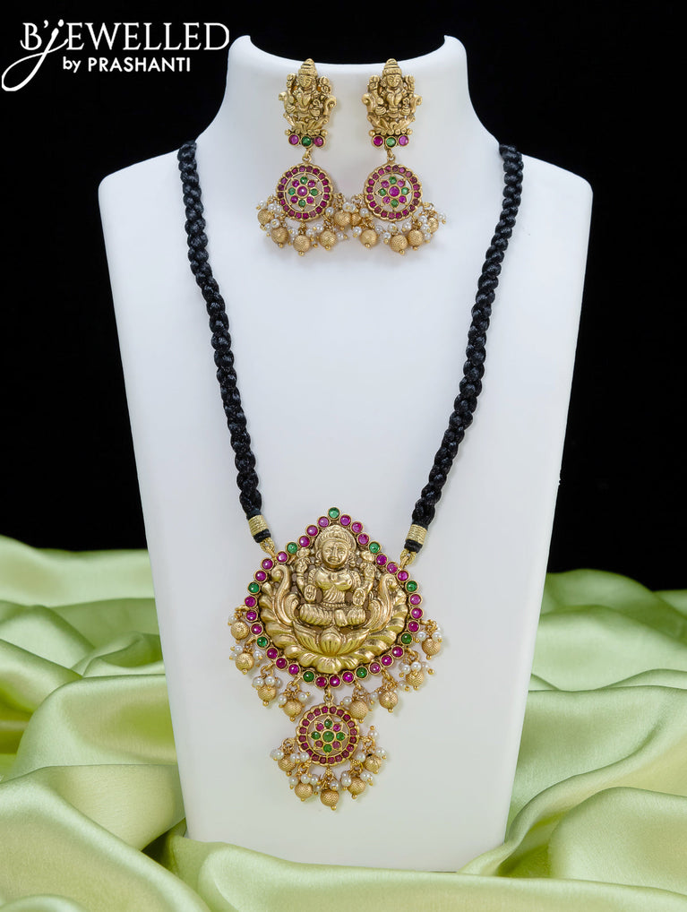 Black thread necklace with kemp stone and lakshmi pendant