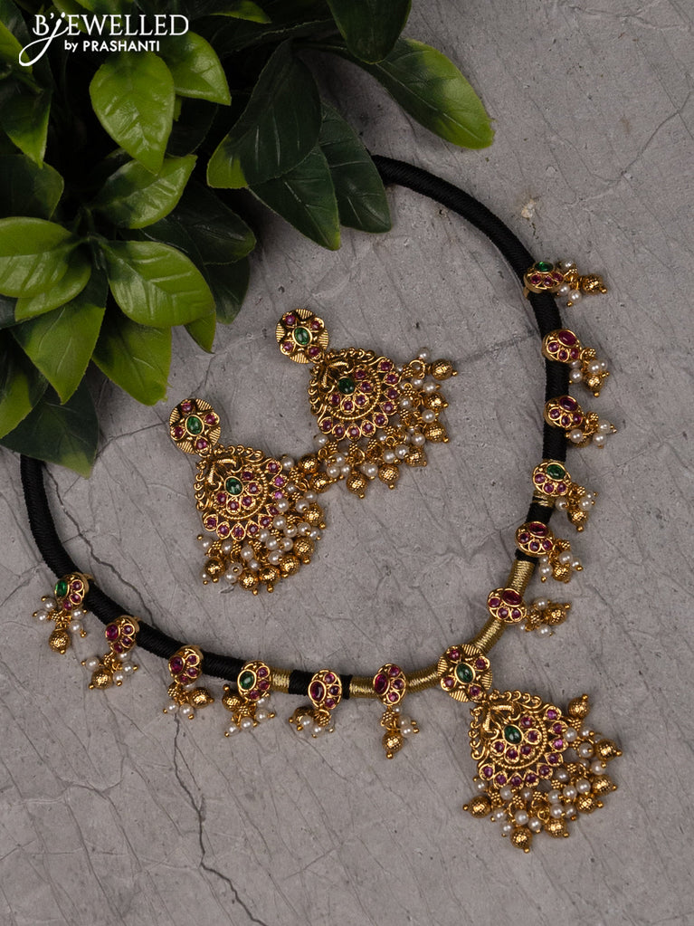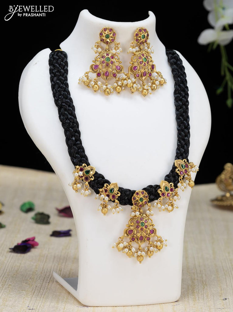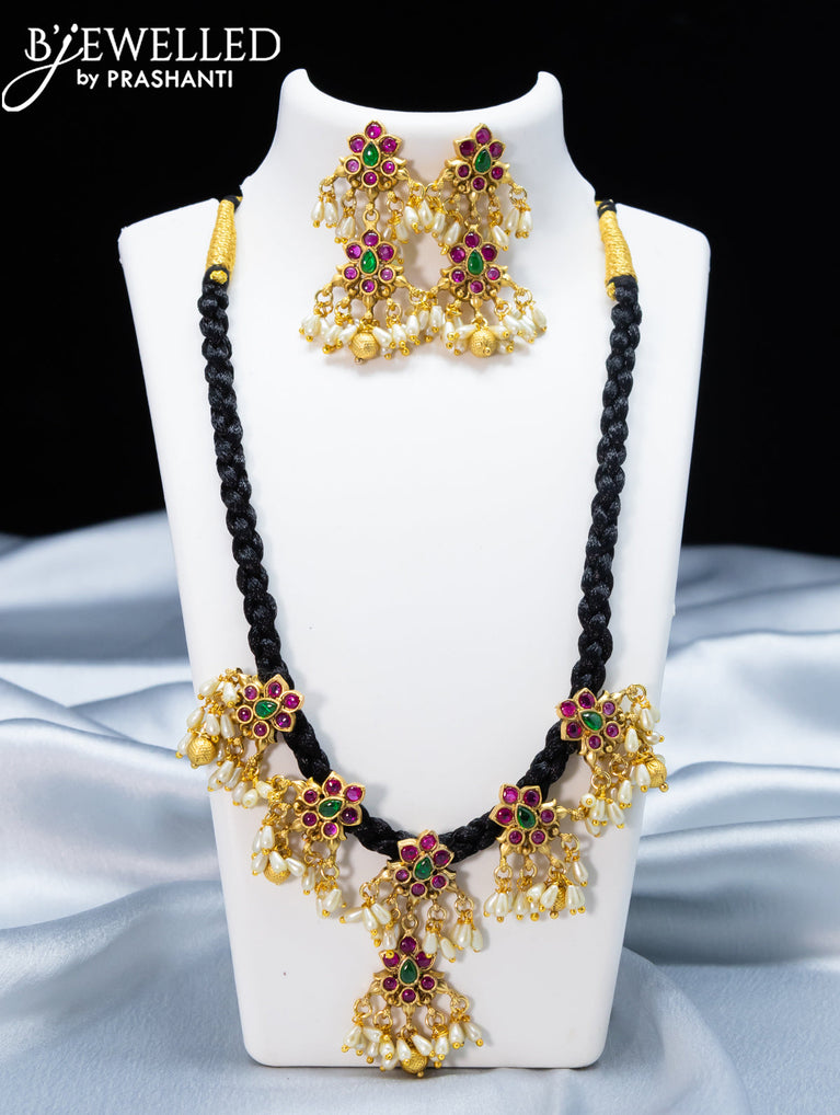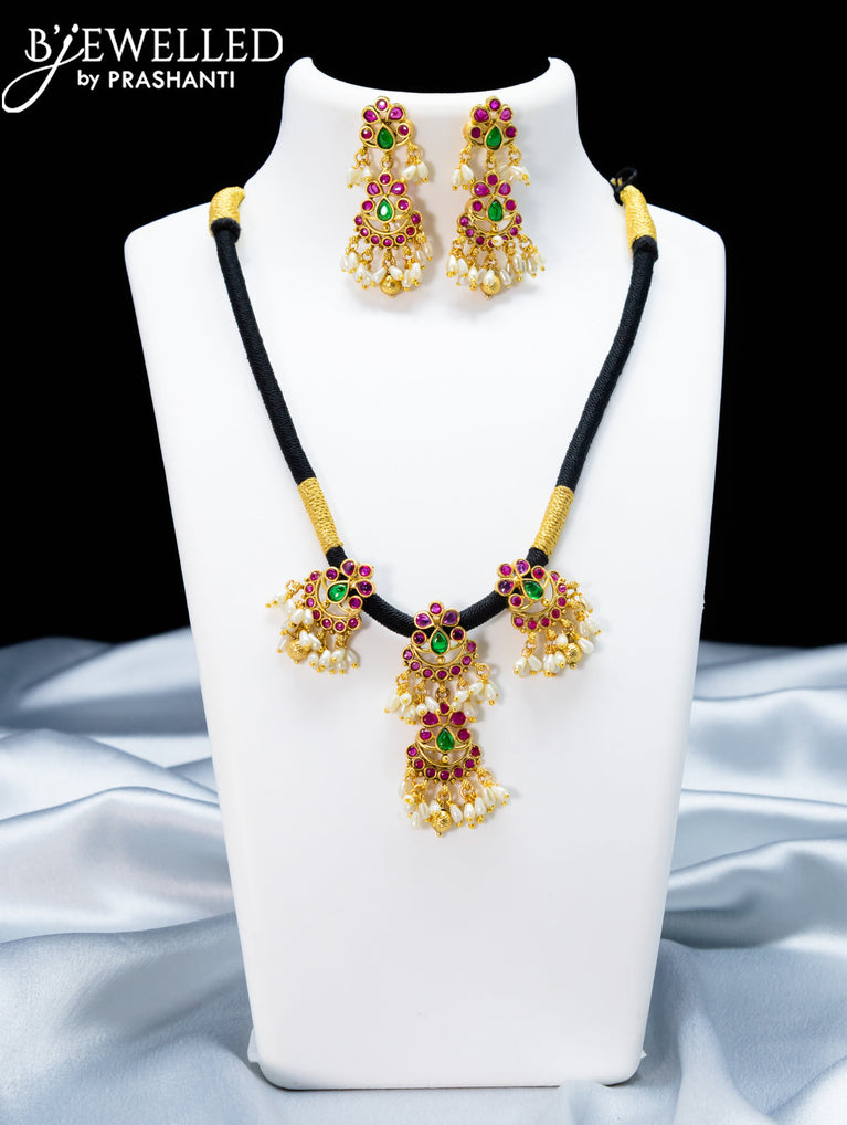 Black thread necklace with kemp stone and pearl hangings without earrings