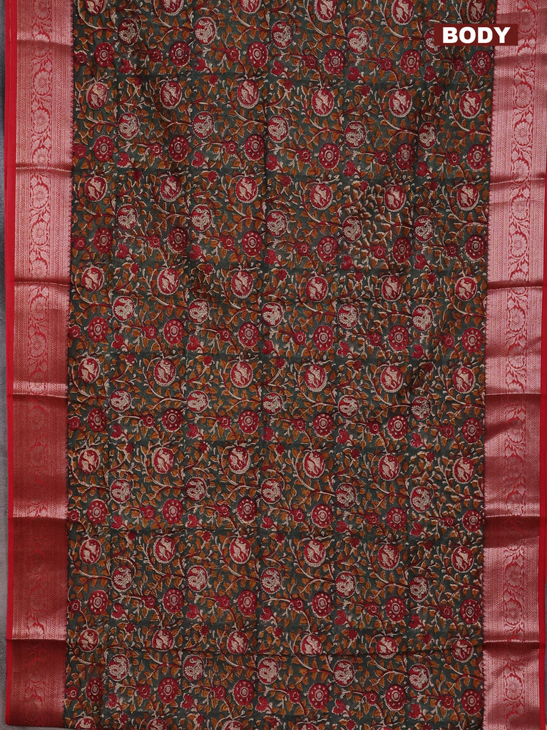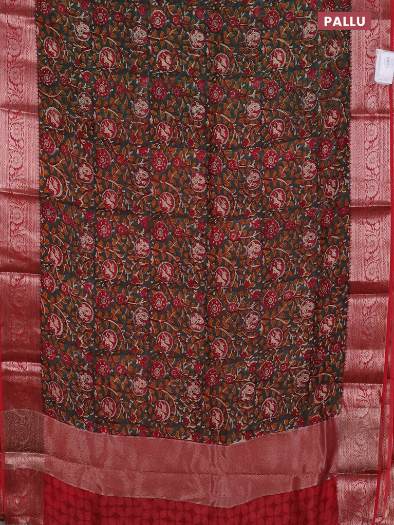 Chanderi silk cotton saree dark green and red with allover kalamkari prints and banarsi style border