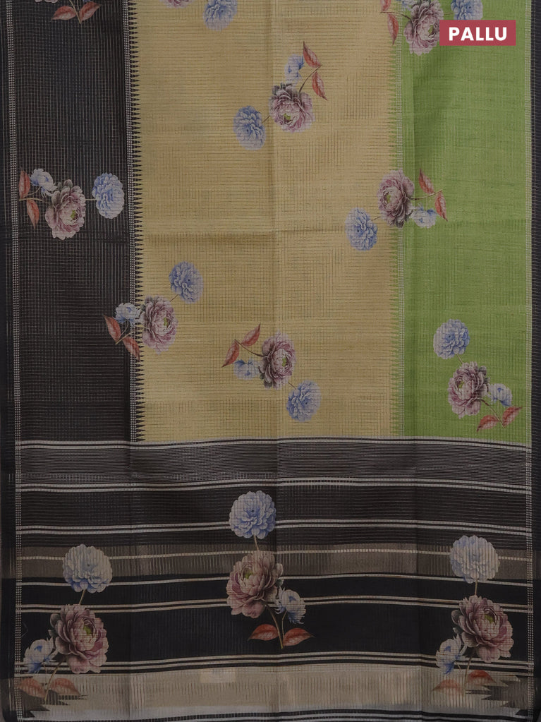 Chappa saree sap green and beige with allover small zari checked pattern and floral digital printed pallu