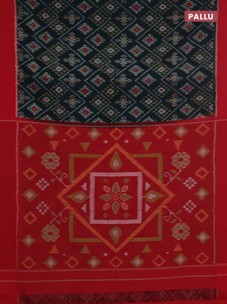 Ikat cotton saree bottel green and red with allover ikat butta weaves and simple border