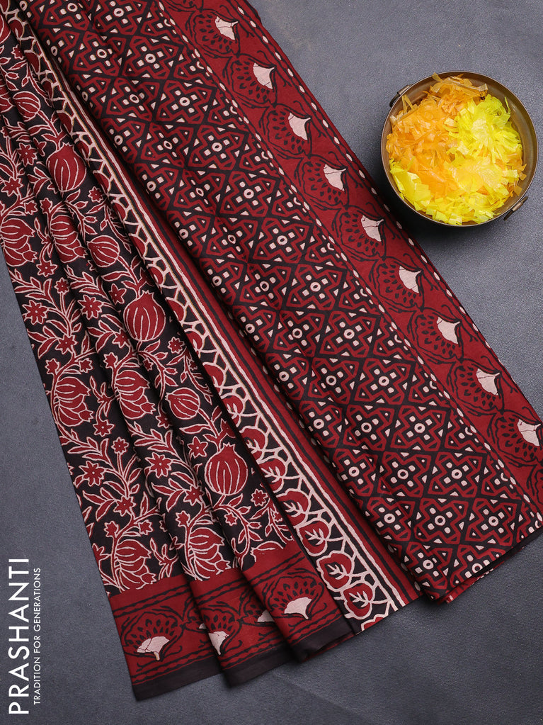 Jaipur cotton saree black and maroon black with allover kalamkari prints and printed border