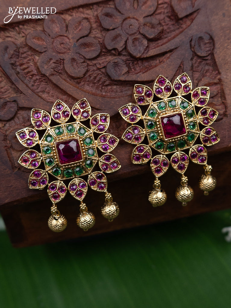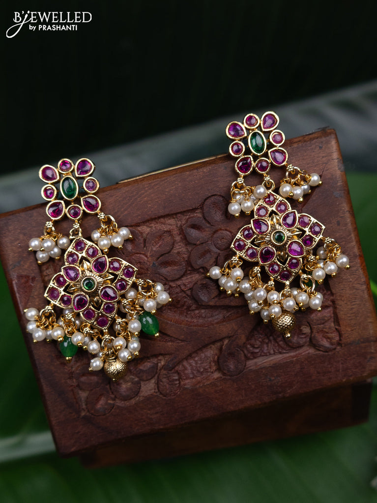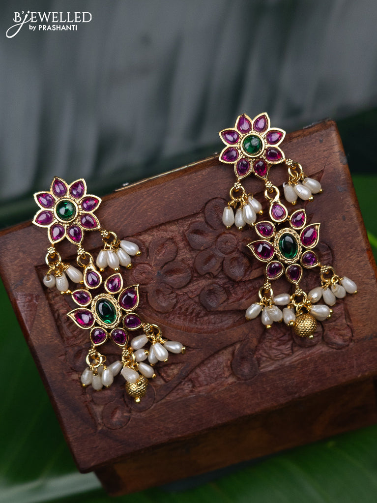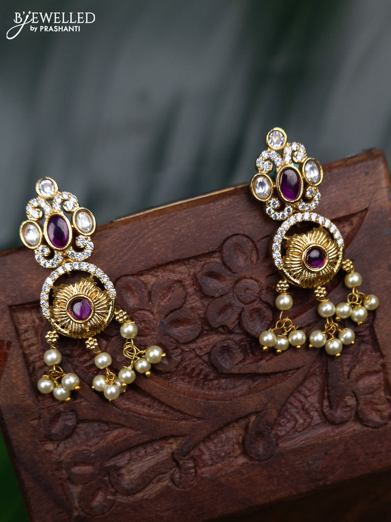 Antique earring with pink kemp & kundan cz stones and pearl hangings