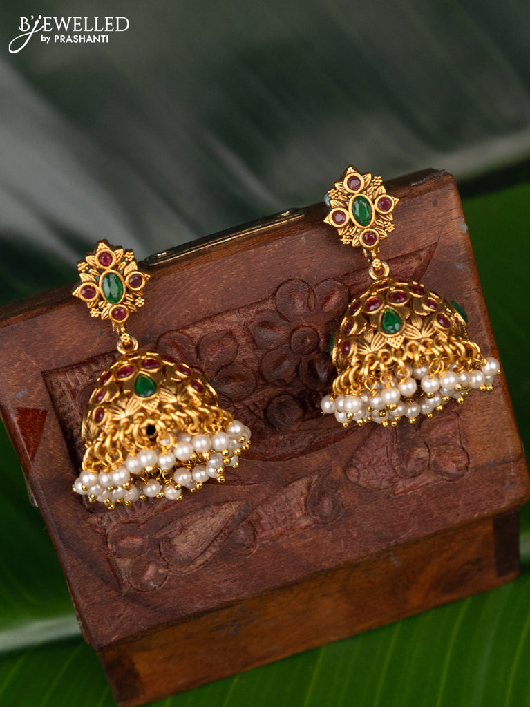 Antique jhumka floral design with kemp & cz stones and pearl hangings