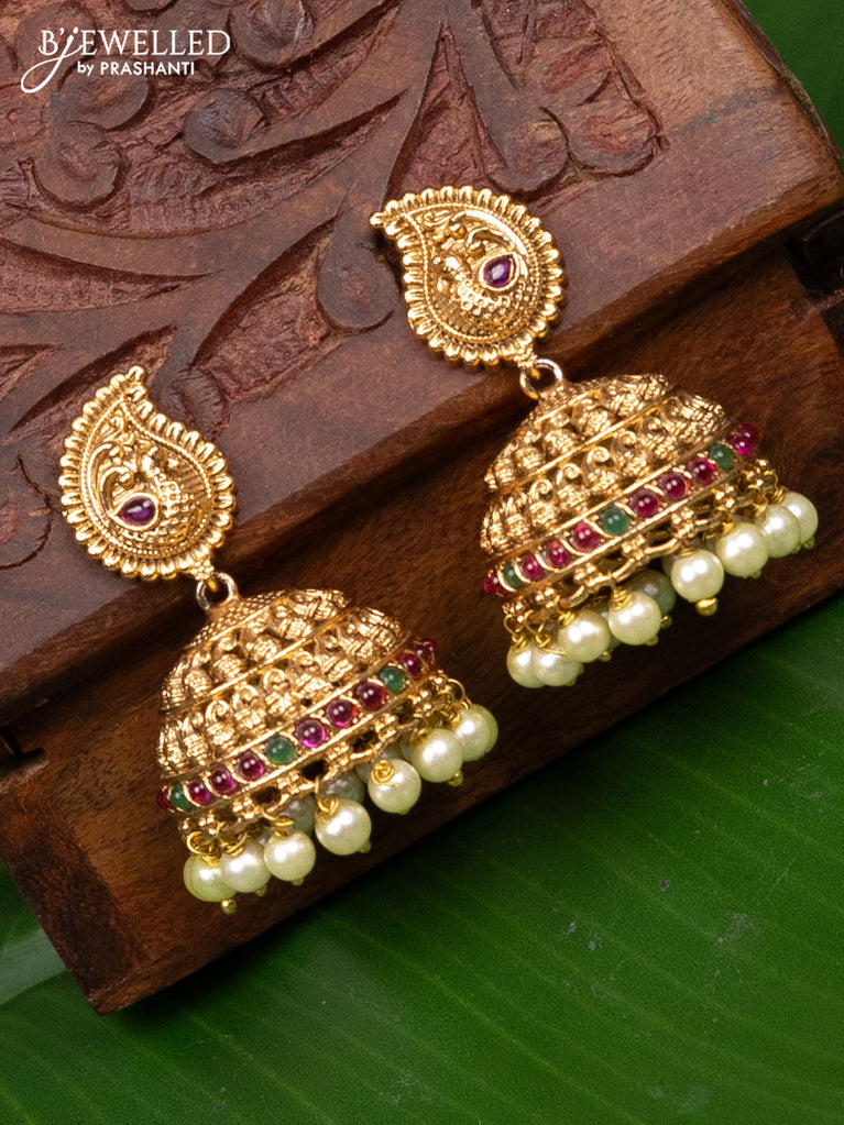 Antique jhumka with kemp & cz stones and pearl & beads hanging