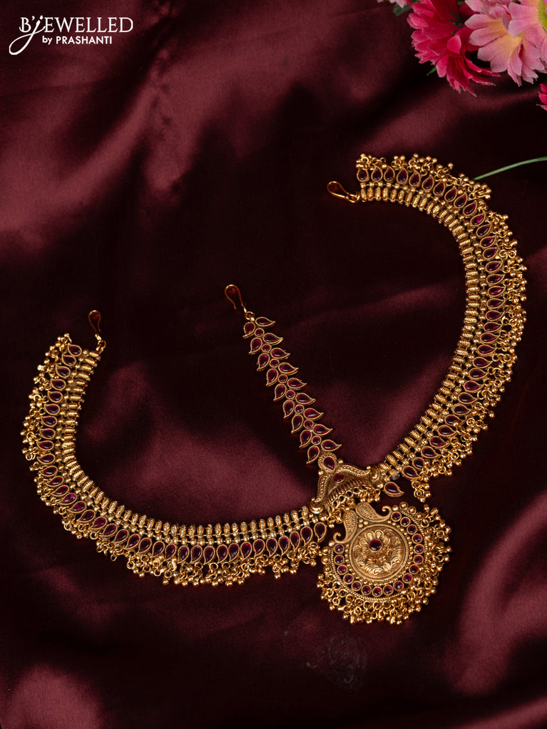 Antique maang tikka floral design with pink kemp and golden beads hangings