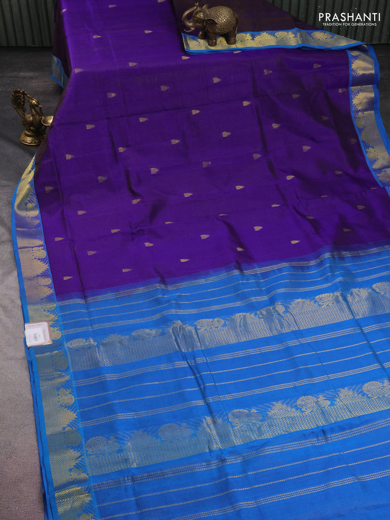 10 yards silk cotton saree blue and maroon with allover vairaosi pattern & zari buttas and zari woven border
