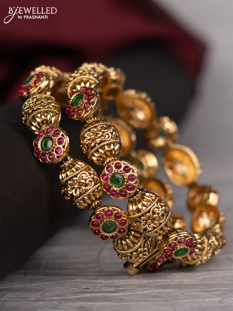 Antique screw type bangle with lakshmi design and pink kemp stones