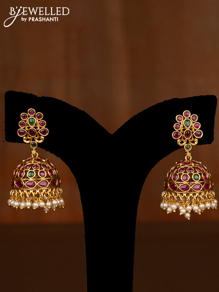 Antique screw type Jhumka with kemp stones and pearl hangings