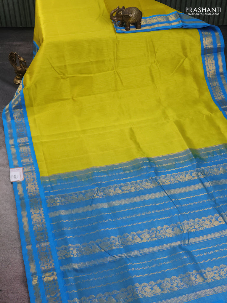 10 yards silk cotton saree lime yellow and cs blue with plain body and zari woven border