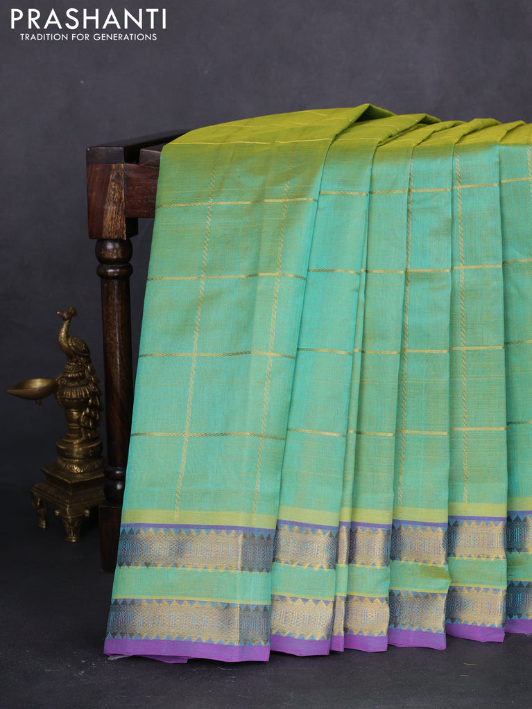 10 yards silk cotton saree light green and violet with allover zari checked pattern and zari woven border