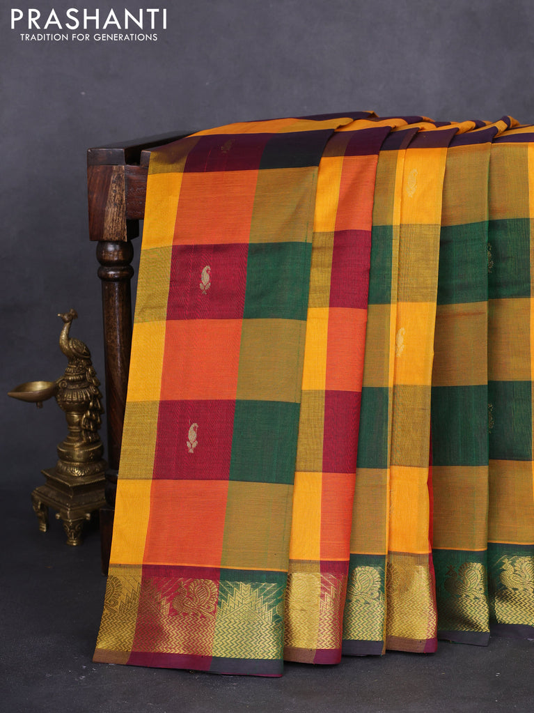 10 yards silk cotton saree multi colour and green with allover paalum pazhamum checks & buttas and zari woven border
