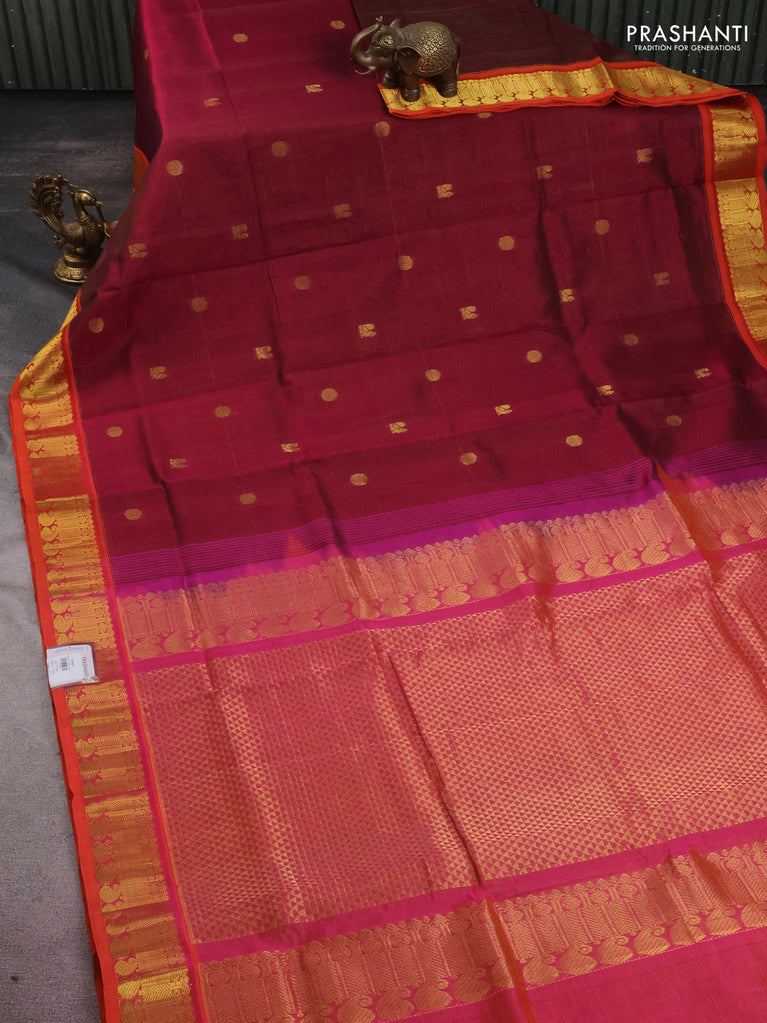10 yards silk cotton saree maroon and dual shade of pinkish orange with allover vairaosi pattern & zari buttas and zari woven border