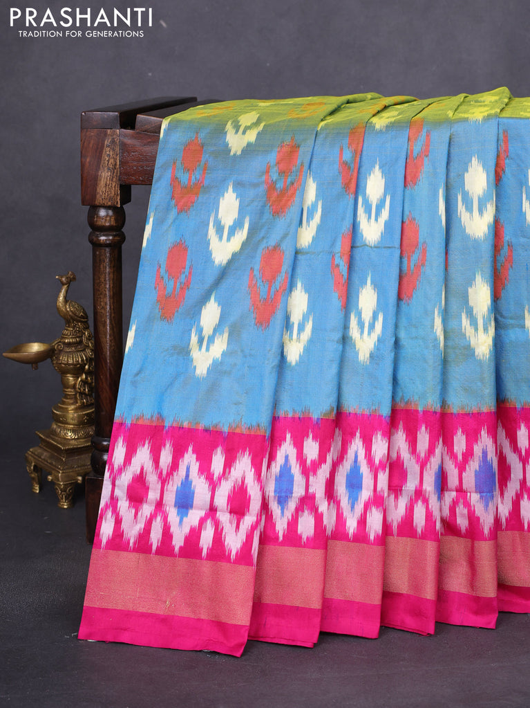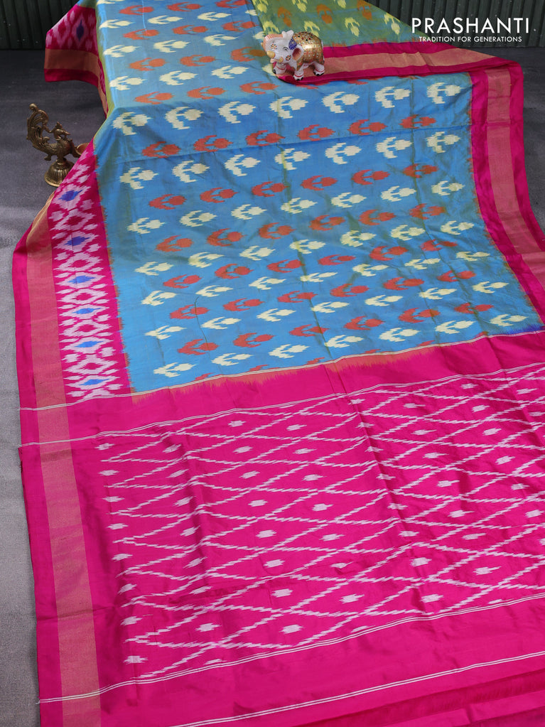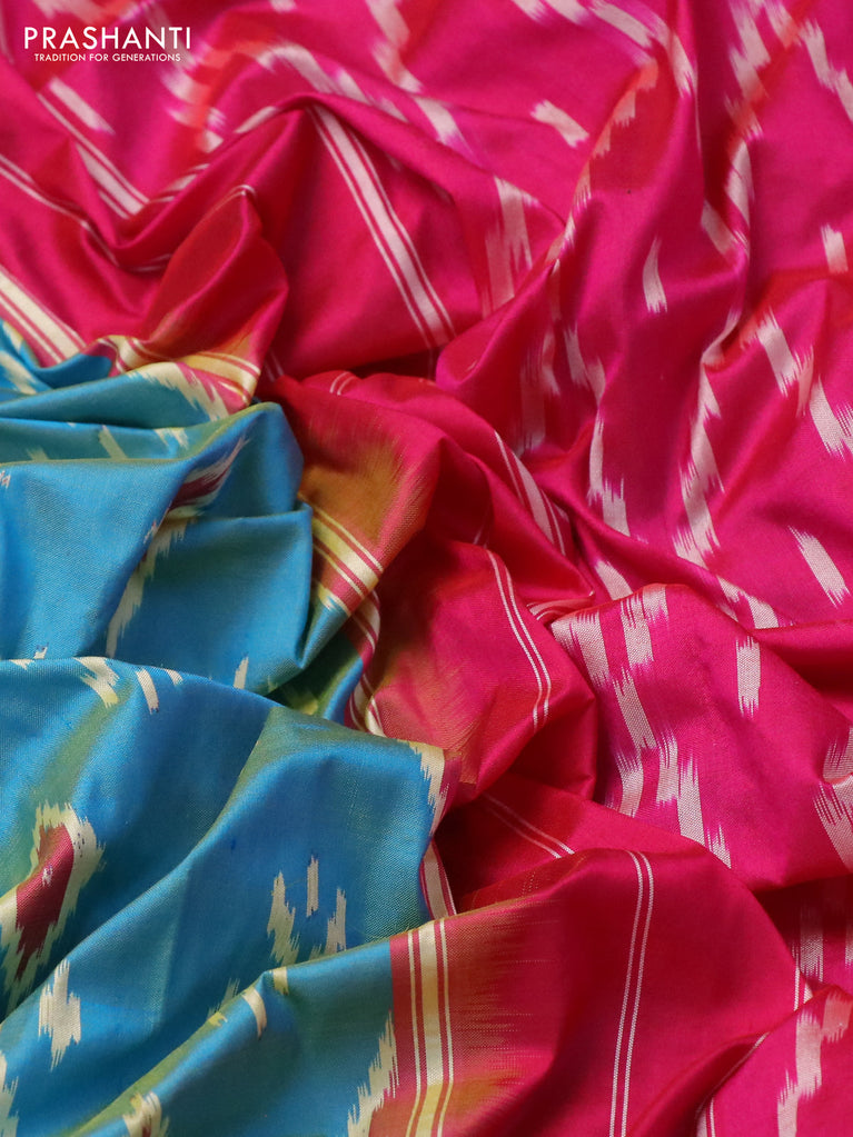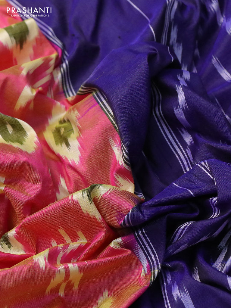 Pochampally silk saree dual shade of blue and magenta pink with allover ikat butta weaves and long ikat woven zari border