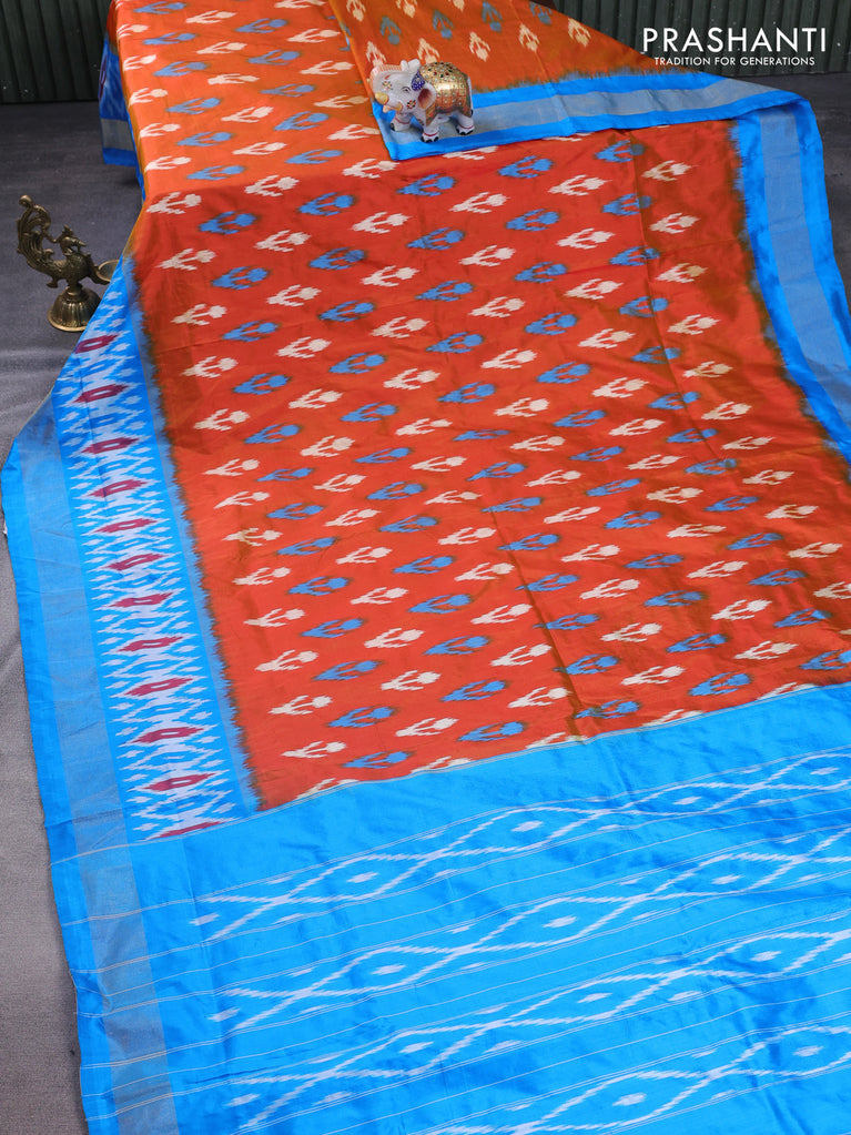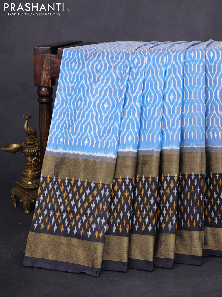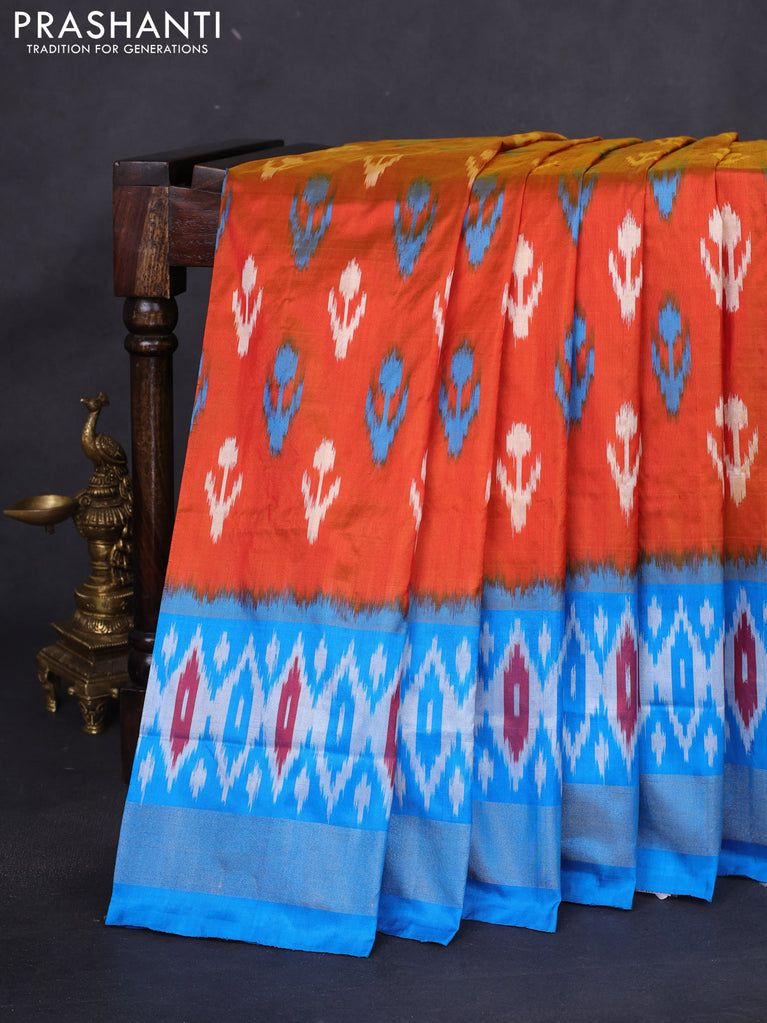 Pochampally silk saree dark mustard and cs blue with allover ikat butta weaves and long ikat woven zari border