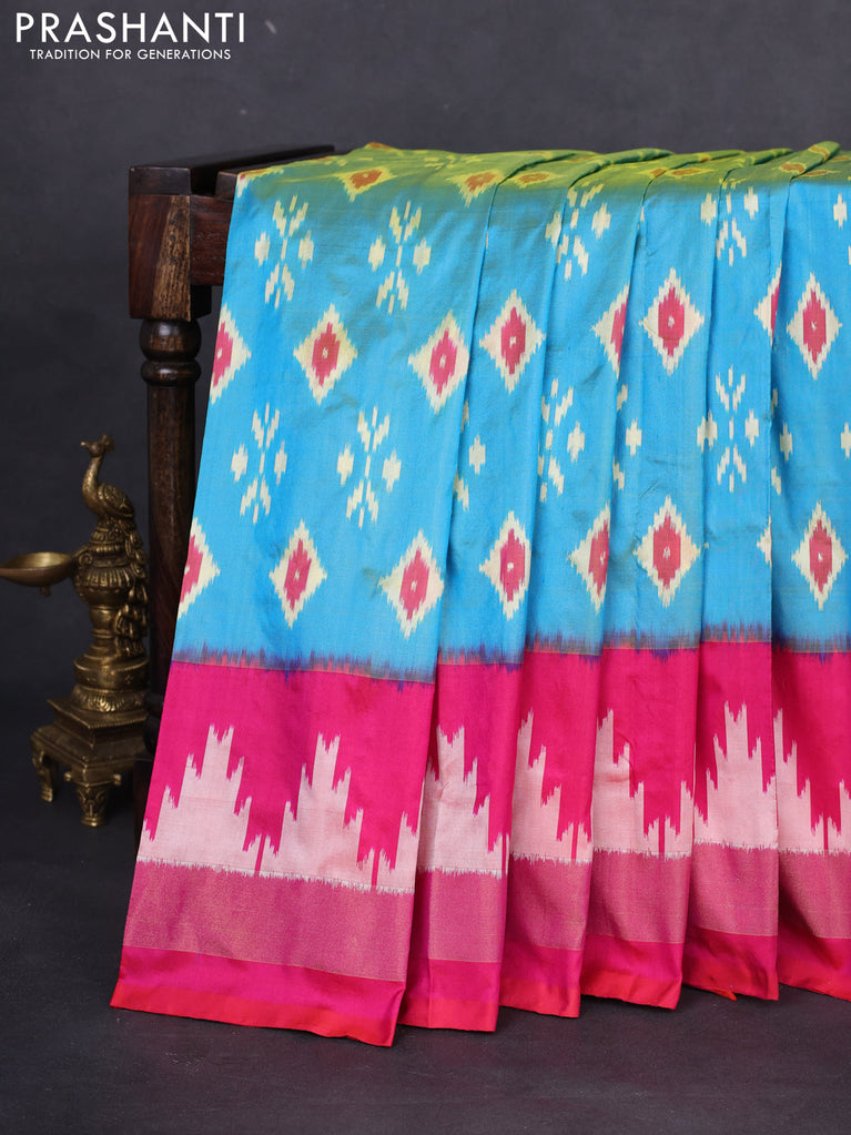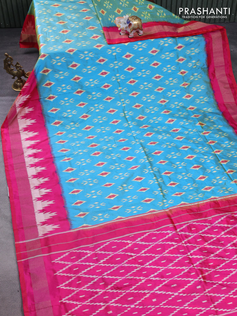 Pochampally silk saree dual shade of teal blue and pink with allover ikat butta weaves and temple design zari woven border