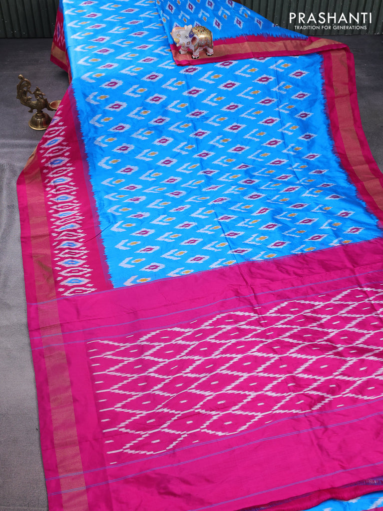 Pochampally silk saree cs blue and pink with allover ikat butta weaves and long ikat woven zari border