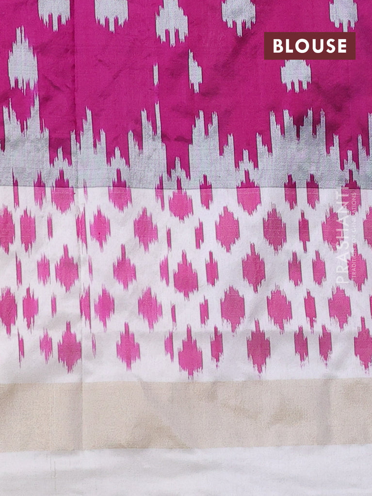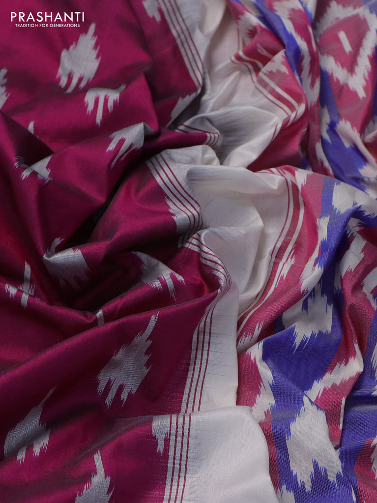 Pochampally silk saree dark magenta pink and cream with allover ikat butta weaves and long ikat woven zari border