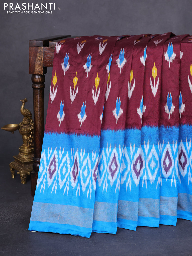 Pochampally silk saree deep maroon and cs blue with allover ikat butta weaves and long ikat woven zari border
